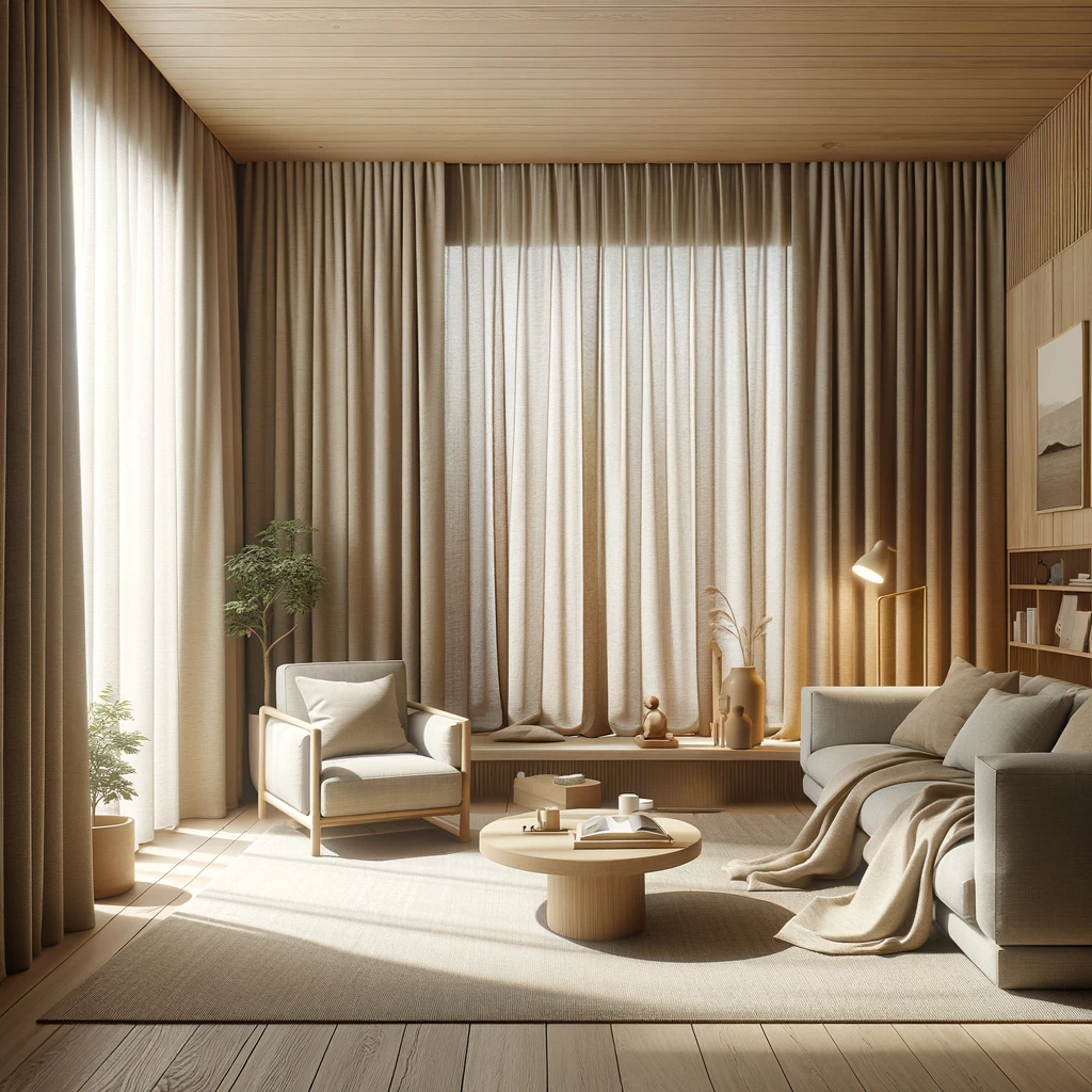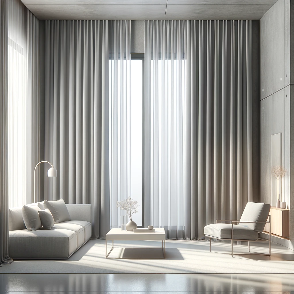 風格強調功能性與實用的平衡,窗簾選擇低彩度的顏色,如白色、淺灰色、米色和卡其色。這些溫和的顏色能夠與簡約風格的裝飾元素搭配,增添空間的明亮感。