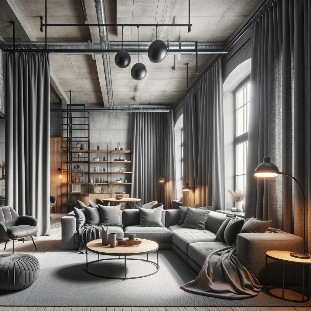 工業風格突顯原始、粗選的美感,窗簾顏色以深灰色、淺灰色和深綠色等為主。這些顏色不僅能夠與工業風格的裝飾元素如金屬、磚牆和裸露的等管道相匹配,也能增強空間的個性和層次感。
